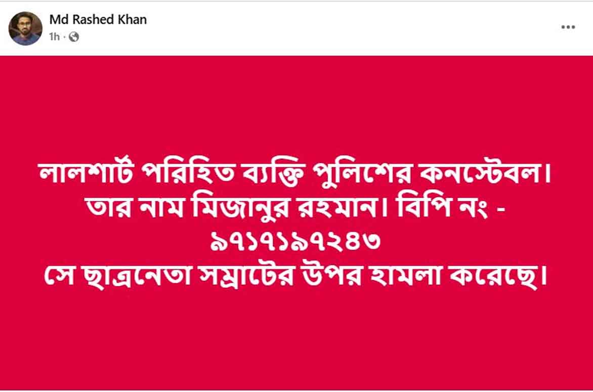 শনিবার (৩০ আগস্ট) সকালে এক ফেসবুক পোস্টে গণঅধিকার পরিষদের সাধারণ সম্পাদক রাশেদ খান দাবি করেন, হামলাকারী ওই ব্যক্তি পুলিশের কনস্টেবল মিজানুর রহমান। তার বিপি নম্বর ৯৭১৭১৯৭২৪৩।