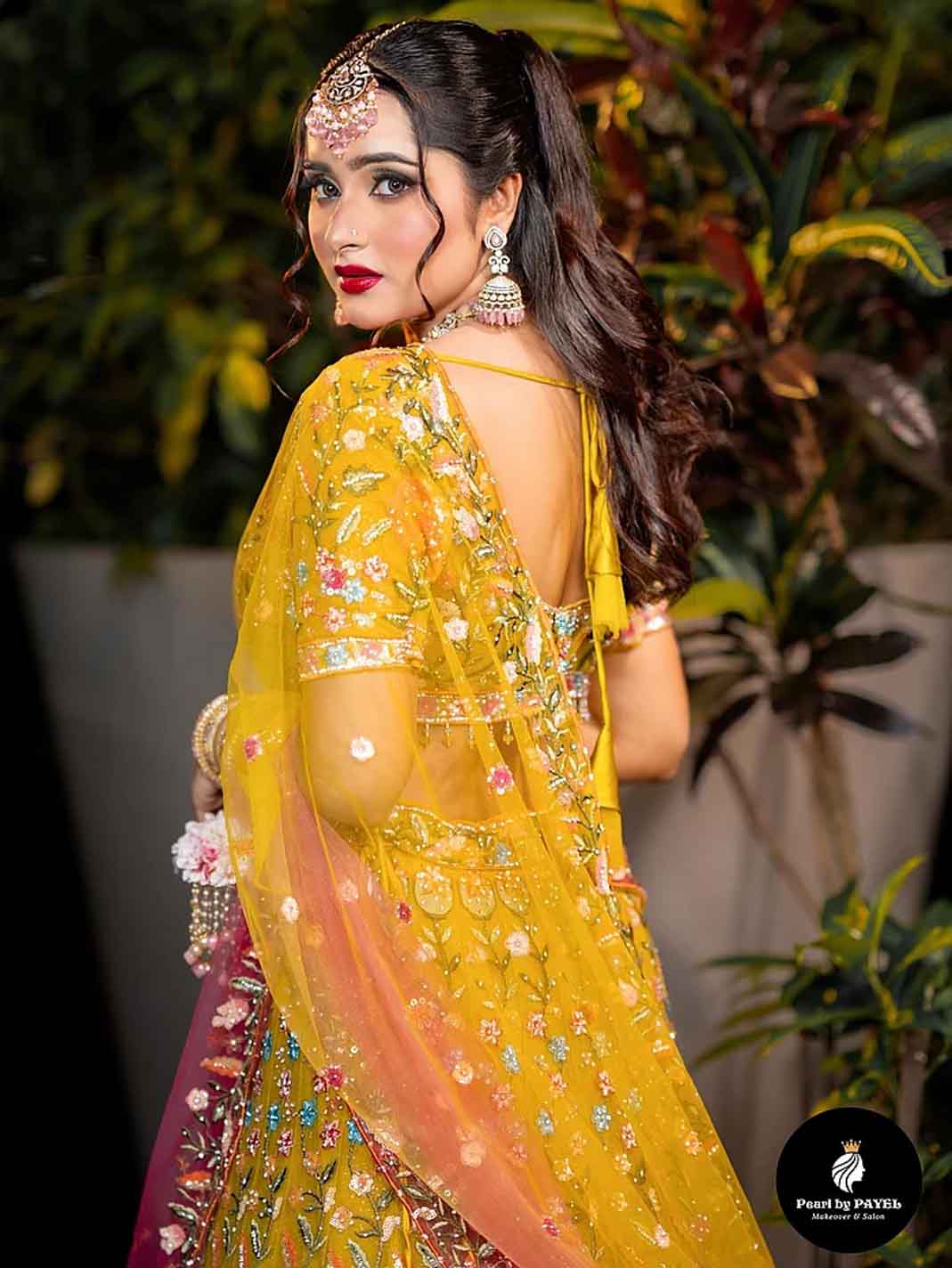 ব্যাকলেস ব্লাউজের সঙ্গে ফুলেল কারুকাজ করা উজ্জ্বল হলুদ ব্রাইডাল লেহেঙ্গা পরেছেন কেয়া