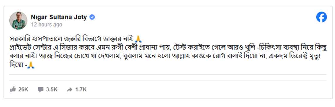 ফেসবুকে তিনি লেখেন, ‘সরকারি হাসপাতালে জরুরি বিভাগে ডাক্তার নেই। প্রাইভেট সেন্টারে সিজার করবেন এমন রোগী বেশী প্রাধান্য পেয়ে থাকেন। টেস্ট করাতে গেলে আরও খুশি। চিকিৎসা ব্যবস্থা নিয়ে কিছু বলার নেই। আজ নিজের চোখে যা দেখলাম, বুঝলাম মনে হলো আল্লাহ কাউকে রোগ বালাই দিয়েন না। একদম সরাসরি মৃত্যু দিও।’